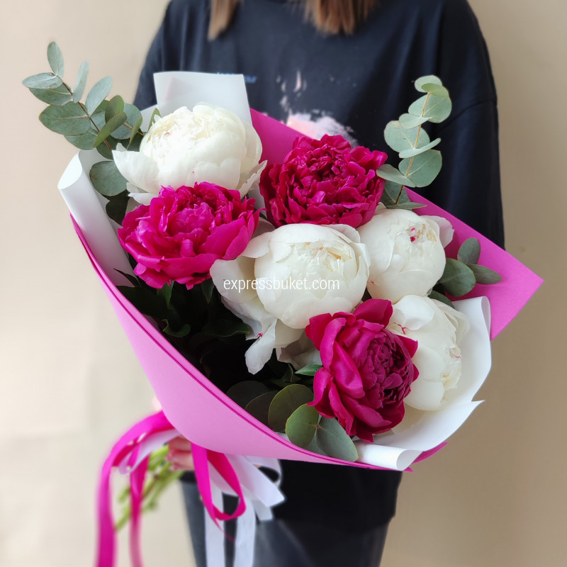 Пион - 7;Эвкалипт большой - 1;Лента атласная - 3;Современная упаковка - 1;Фоамиран лист - 1;