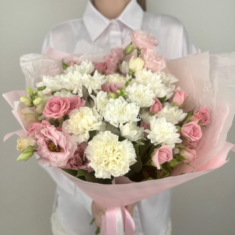 Гвоздика одноголовая цветная - 3;Лента атласная - 1;Роза кустовая - 4;Русскус отеч. - 5;Хризантема кустовая белая - 3;Львиный зев - 2;Современная упаковка - 1;Эустома - 2;
